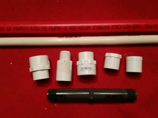 Ir a plomería sección de la ferretería local. He utilizado ¾ pulgadas línea Pex para las hojas, viene en rojo o azul. La primera pieza que se tiene que es el montaje de la línea de Pex en. La línea de pex necesitará pulirse para caber en ella perfectamente, más sobre esto más adelante. El resto del mango se construirá en el montaje. Todas las piezas deben atornillar lo que no necesitas pegar nada.