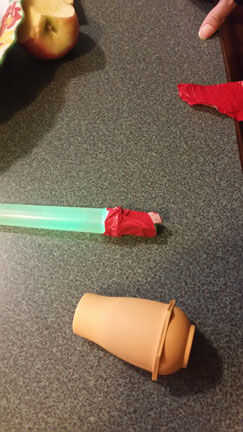 Mi hijo de cinco años quería ser Darth Vader para Halloween y se nos ocurrió este diseño simple sable de luz que fue bastante fácil para él montar con sólo una ayuda limitada de su papá. Aquí está un video explicando la construcción de tres minutos.P