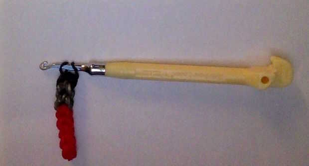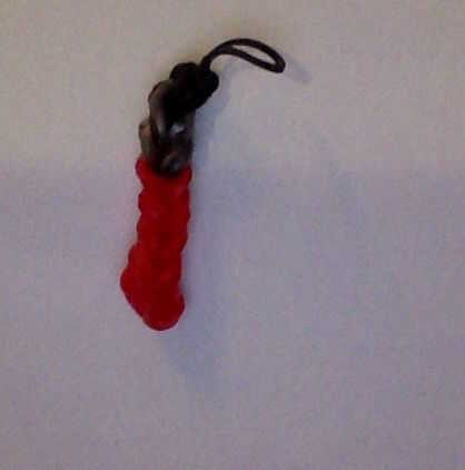 Ahora, toma tres de tus franjas negras y lazo en esta cadena de crecimiento. El negro es el extremo de la manija. Con la una banda negra que le queda, lazo en el extremo de la cadena. (La parte negra, no la parte roja!) Retire el proyecto del gancho y hacer un nudo del resbalón en la una banda negra (también conocido como la banda solamente fina.)