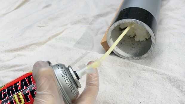 A continuación que tomamos las espadas fuera para rociar espuma en la parte inferior y superior para mantener el medio tubo de PVC en lugar de grandes cosas. Nota: no necesitará hacer esto si los tallarines de la piscina en la parte superior e inferior hacen el sable láser lo suficientemente seguro.