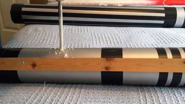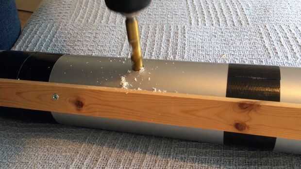 Utilizamos la broca PVC seguro otra vez para hacer un orificio, a mitad de camino por la parte trasera del sable de luz. Esto es para el cable de luz LED. Necesitábamos el agujero un poco más grande por lo que seguimos que con una típico 1/2" broca.