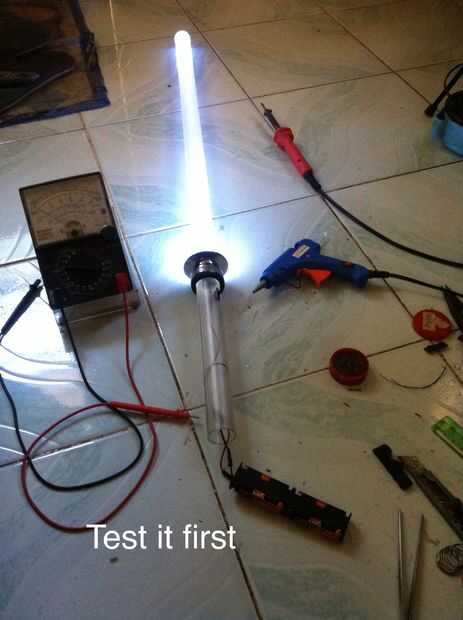 4.After hoja preparados., moverse junto con la electrónica de iluminación de LED sobre cómo encajará su iluminación LED y las baterías dentro de la empuñadura... entonces después de trabajar a la electrónica y algunos pocos de soldadura básica., prueba antes de recuperar su "puño" si la iluminación LED funciona según lo previsto para que la hoja de resplandor. Eres bueno para ir a mover por parte de este proyecto.