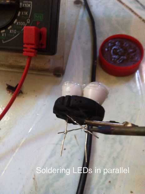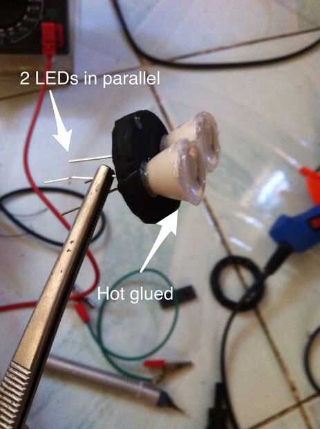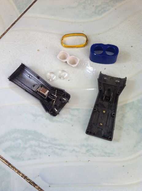 •una nueva linterna compré y aquí tenía una en la célula del botón 4 (1.5v x 4 = 6vdc) en serie configurar caso y ningún resistor o cualquier otros componentes electrónicos soldados con LEDs.
