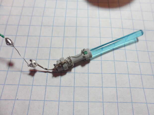 Pegamento azul LED en la parte inferior del mango de sable. El agujero que ha perforado es simplemente dejar que la luz pase a través para iluminar la parte de "láser" de la espada.