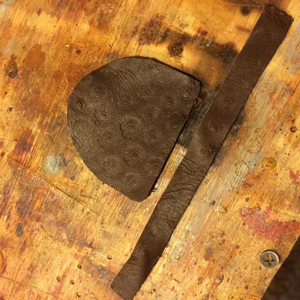 Relieve de la piel con un sello de la flor de una tienda de artesanía. Bastante fácil. Ponérselo, golpeó un par de veces con un mazo.