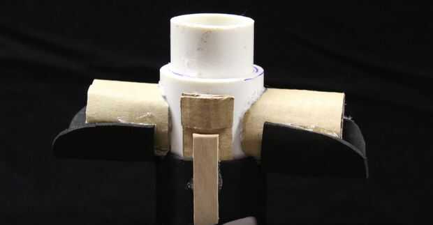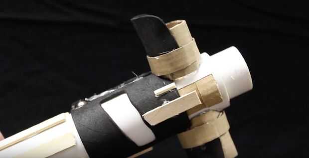 Fotos de referencia usando cortar formas de cartón y espuma de arte para pegar alrededor de la tubería principal de PVC, así como los palitos que conforman la mitad de la empuñadura de la misma.