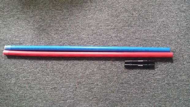 Compré los tubos de PVC de rojo y azules de 3/4 de pulgada y tenía el asociado de The Home Depot corte el tubo de 5' en dos. Si necesita más o menos, puede especificar la longitud deseada.
