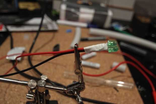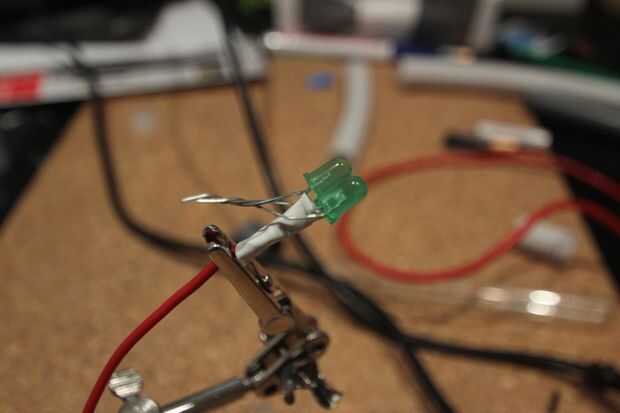 Tomar 3 LED, toque el positivo puntas juntas y soldadura a un alambre rojo, lo mismo para las patas negativas pero soldar a un cable negro.
