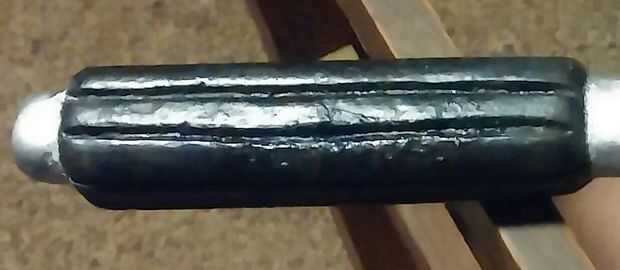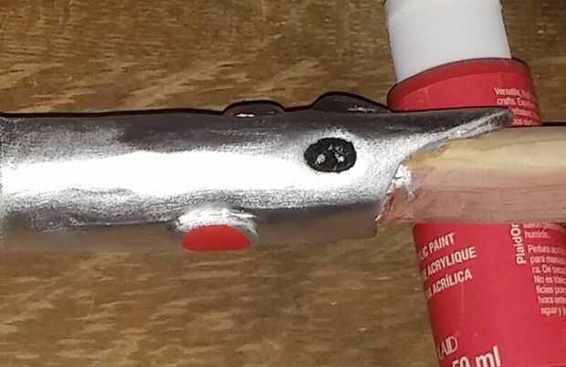 Utilicé una pintura de aerosol de plata metálica de Lowe, y utilicé un spray negro de goma también se vende en Lowe... Tuve algunos arte pintar en negro y rojo... que he utilizado para los botones y el interior del cargador de dos patas. Pegado la parte de palillo y los apretones de la manija, luego roció la empuñadura con la pintura de plata. una vez seco desenvueltos y rocía el mango con las siguientes de goma las indicaciones en el can...once que seca me re pegado el palo y retocado cualquier plata... después de todo la pintura y el caucho ha secado completamente pinté el rojo en los botones que se encuentran en la parte superior e inferior de la palanca