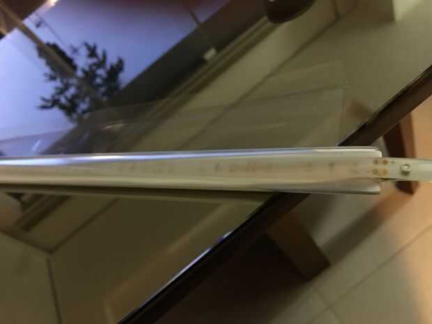 2. Cole como fitas de LEDs na régua de MDF (o PVC), uma de cada lado da régua. Isto sirven para decriptar fitas retas dentro da lâmina, e impedir elas se movimentem. Depois de coladas como fitas, matricular un régua com como fitas no papel celofane, deixando bem justo e prendendo com fita transparente. Três fitas são suficientes: Uma em cada extremidade e uma no centro.