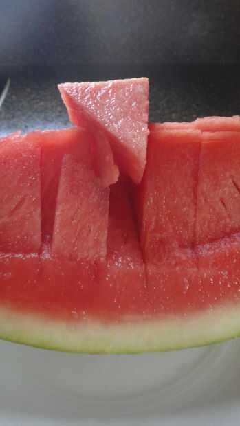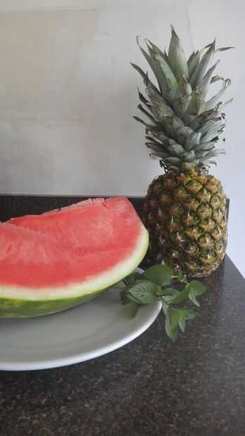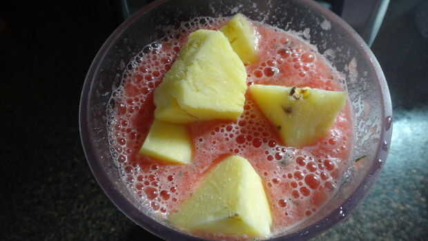 Añadir la sandía a la batidora. Smoosh él abajo con una cuchara de madera. Aquí utilicé mi mango de cuchillo. Agregue la menta y mezcle durante unos segundos. Añadir los trozos de piña y mezcla nuevamente hasta que quede suave. Mina sirvo en una copa de fantasía.