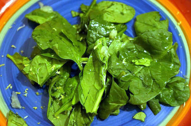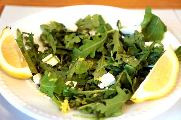 Placa de la rúcula en un plato y decorar con limón, ralladura de limón, queso feta y goteos de la cacerola.