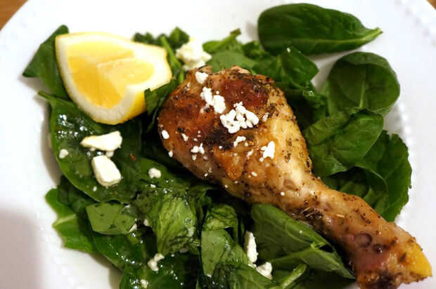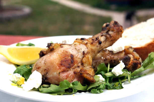 Retire el pollo de la hornilla y coloque el pollo en el plato... Salsear los goteos de la cacerola el pollo, zumo de limón y la ralladura de limón y espolvorear el queso feta en la parte superior.