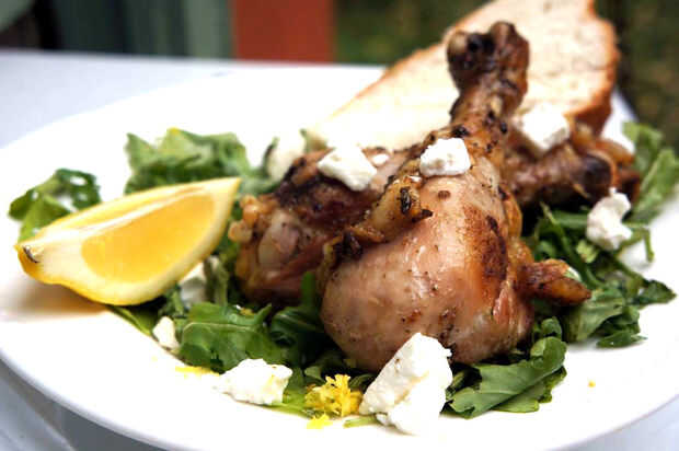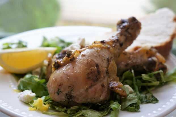 Pollo con hierbas bajo ladrillos
