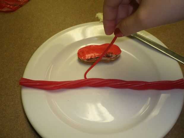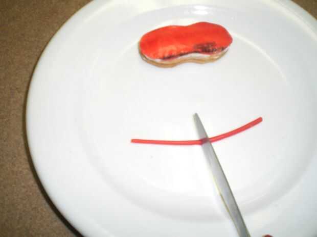 Tire pedazos de una cadena de Twizzler apagado y corte 2 – 1 pulgada para las bandas de cada flip-flop están haciendo.