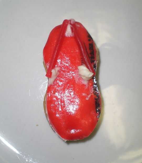 Coloque los pedazos de Twizzler desde el punto superior de helar a cada uno de los lados para aparecer como correas de un flip-flop.