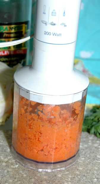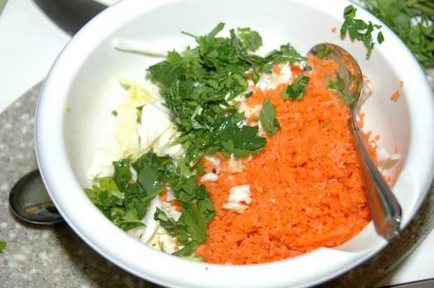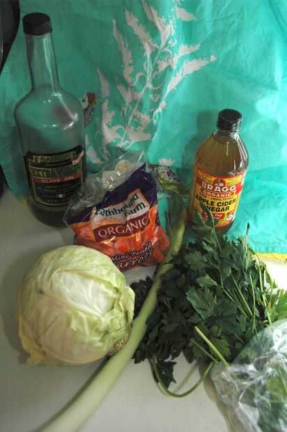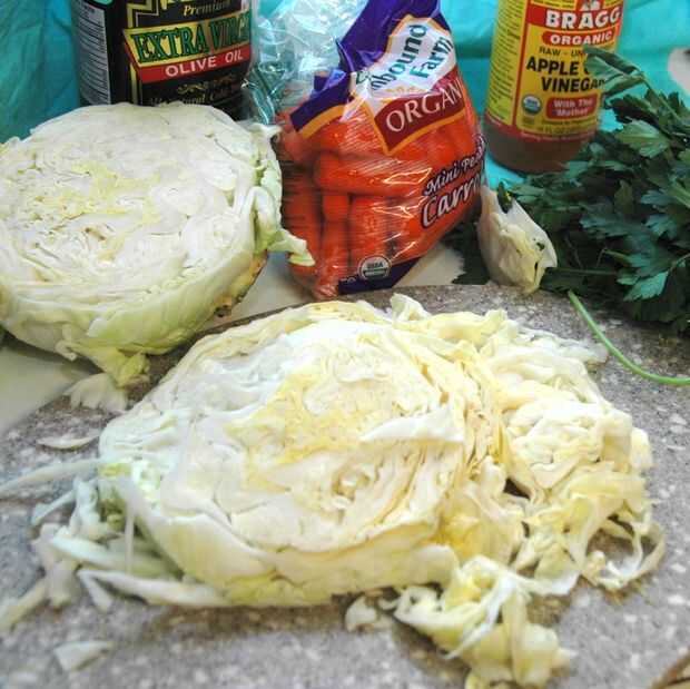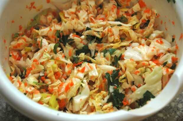 Comience por picar el mitad repollo. Trocear los puerros hasta que tenga 1/2 taza y añade a la col. Utilizar un procesador de alimentos para picar finamente las zanahorias y agregar 1/2 taza de ésos también. Picar 1/4 taza perejil y añadir que en.