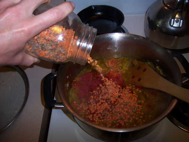 Deje que el calor de líquidos hasta hervir, luego cubrir y reducir el calor. Deje que la sopa hierva a fuego lento durante unos veinte minutos o hasta que las lentejas estén tiernas. Retirar del fuego.