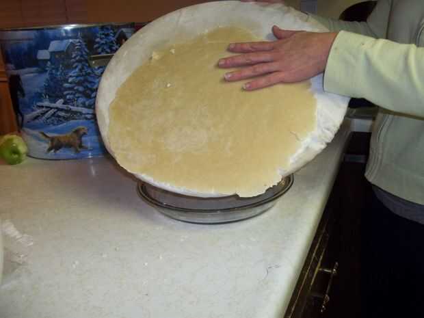 Levante suavemente el disco de masa o estera e Incline levemente hacia la tartera.  Agitar suavemente para que se deslice apagado y en la placa.  Presione suavemente la corteza en las esquinas de la placa.  Como nota lateral, prefiero una tartera de vidrio.  La corteza de la parte inferior es agradable y fresco.