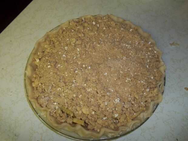 Mezclar la harina, avena, azúcar morena y canela. Luego mezclar con la mantequilla utilizando su cortador de repostería o dos cuchillos, como cuando hiciste la corteza. Cuando haya terminado debe ser realmente desmenuzable con los trozos más grandes siendo aproximadamente del tamaño de guisantes. Esparcir el relleno uniformemente sobre las manzanas. Es un montón de relleno. No te preocupes, todo fundirse con los jugos de manzana y convertir en bondad delicioso.