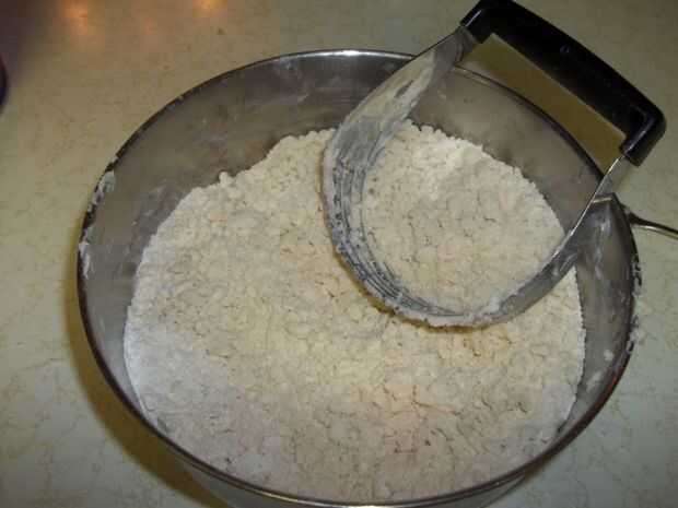 Desea utilizar un tazón de fuente es tipo de ancho con un fondo plano. Mezclar la harina y la sal. Luego se mezclan en el acortamiento. La herramienta ideal para esto es un cortador de pastelería, pero si no tienes uno (realmente hay que ir conseguir uno si quiere hacer pie a menudo) utilizar dos cuchillos de mantequilla y la manteca en la harina de "corte". Mantenga trituración o corte hasta que comience como harina de maíz. Usted tendrá algunos trozos más grandes, así que no tome todo el día tratando de conseguir que todo pequeño.