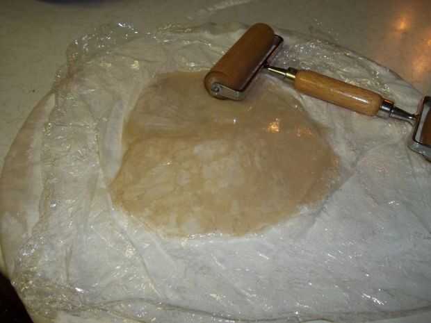 Poner una cantidad generosa de harina (al menos 1/4 taza) sobre la superficie de rodadura. Difundirlo en todas partes. Luego, desenrolle su tarta y cubierta con el abrigo plástico. Mantenga la envoltura plástica entre la masa y el rodillo, luego empezar poco a poco, aplanar la masa. Desea mantener rodando alrededor de los bordes, por lo que no presenta grietas.