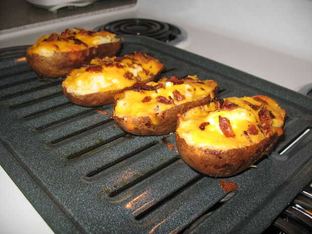 Ahora que tienes las patatas rellenas y coronado, moverlos hacia atrás a su bandeja de hornear/asar a la parrilla. Una vez más pre-calentar el horno, esta vez a 375 grados. Cuando el horno se calienta puede seguir adelante y coloque sus papas en el estante del medio y dejarlos ahí por unos 15-20 minutos o hasta que el queso se haya derretido y el centro es cálido. (puede que necesite tomar una patata hacia fuera después de 15 minutos, corte abierto y ver si el centro es caliente)