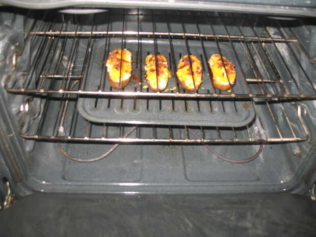 Cuando que las patatas se calientan a través de todo el camino, se retire del horno y déjelos enfriar durante al menos 10 minutos. No olvide apagar el horno.