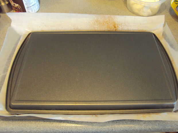 Poner otra bandeja para hornear galletas sobre el papel de cera/pergamino que usted acaba de poner sobre el pastel. Se trata de algo parecido a un pastel emparedado entre dos galletas. Si no tienes una hoja de galleta recomendaría utilizando un gran libro.