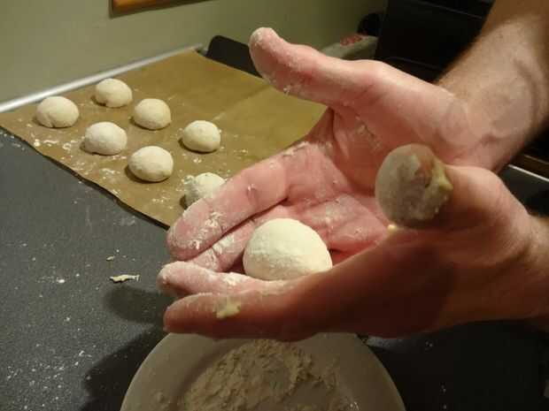 Rodillo la masa en pequeñas bolas en tus manos - si usted está interesado para uniformidad, un peso de unos 30g será de derecho. Puede que necesite mantener sus manos harina Si la mezcla está húmeda para evitar que se pegue demasiado.