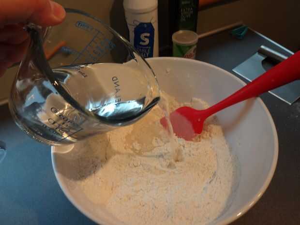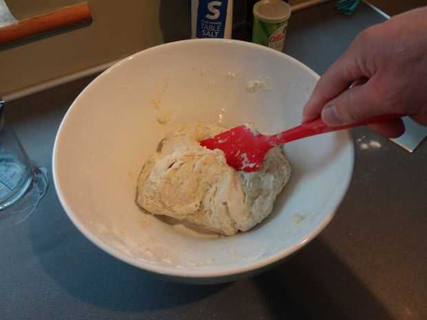 Seguir mezclando en poco a poco hasta que la harina desaparezca - luego añadir lo suficiente para que la masa es pegajosa (pero no gloopy). La cantidad variará en su harina como absorbente es - utilicé unos 380ml para este lote. Verifique el cuadro con mi mano pegajosa cómo debe ser.