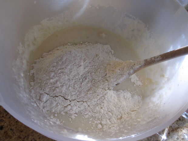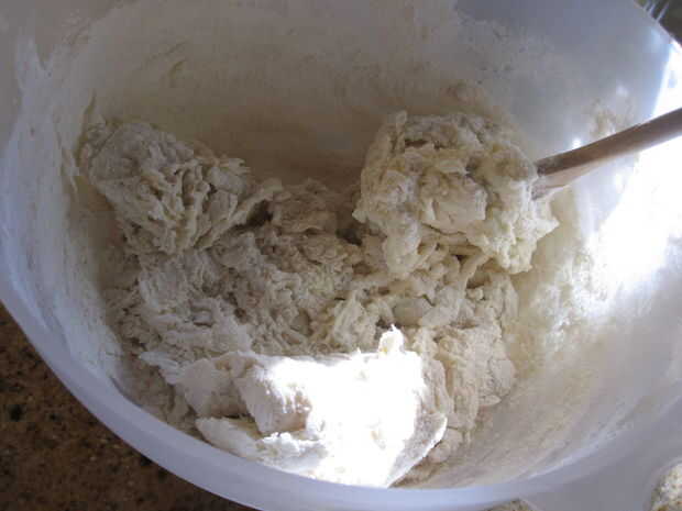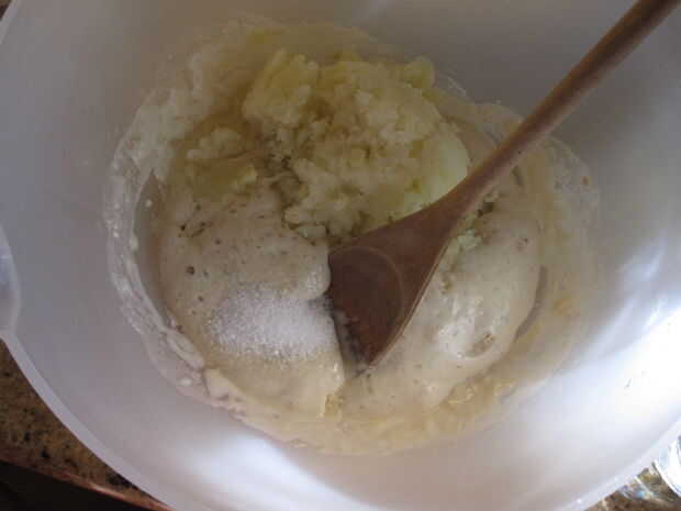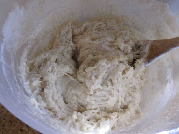1) a continuación, agregue la patata rallada, sal, 2 cucharadas de aceite de oliva y 1/2 taza de agua a la esponja. Mezclar. 2) poco a poco agregue el 2 a 2 1/2 tazas de harina hasta que la masa salga juntos. La masa estará pegajosa y clumpy, pero no mojado.