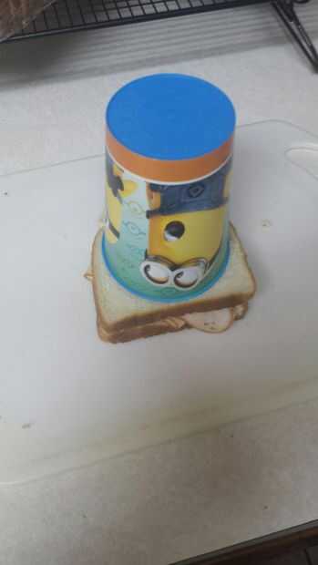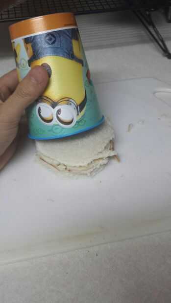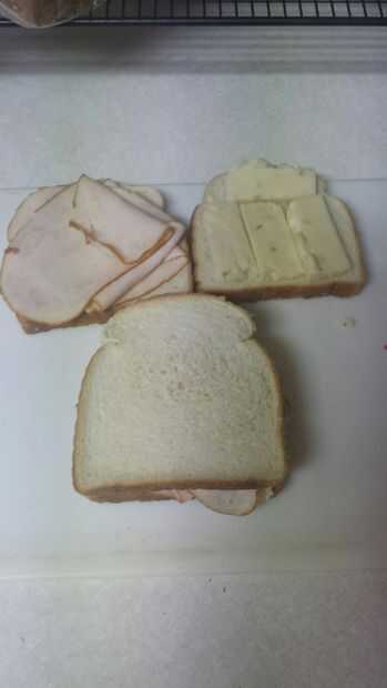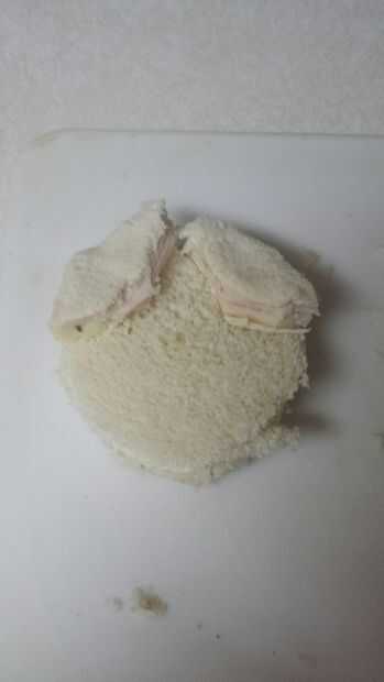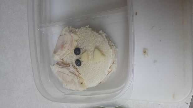 Para comenzar a tomar el pan y hacer un sándwich. He utilizado pechuga de pollo del asador y queso pepper jack. Después de su sandwich Coloque a la guía en la parte superior y corte hacia fuera un círculo limpio. Hacer otro sándwich y corte a la hoja en forma de óvalos. Cortar algo de carne y añadir a los oídos para los detalles. Y por último añadir los ojos, nariz y boca para esto usé el queso. Por último le coloque en el recipiente y le deseo suerte.