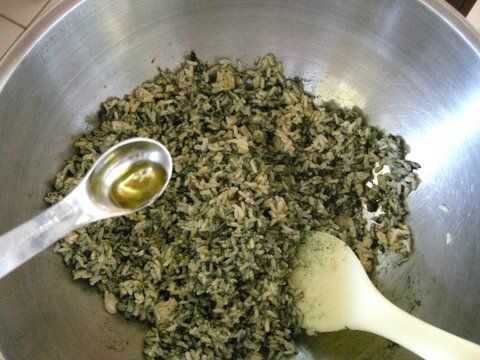 Agregue 2 cucharaditas de aceite de oliva a la mezcla de arroz y revolver bien.