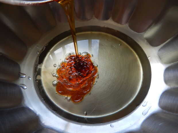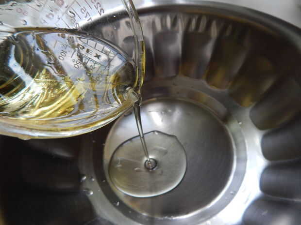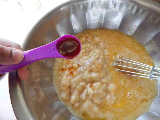 En un tazón grande, batir el aceite, miel y azúcar morena. Añadir los huevos y batir bien. Mezclar el puré de banano, esencia de vainilla y revuelve.
