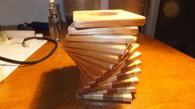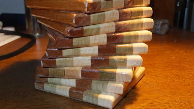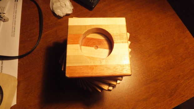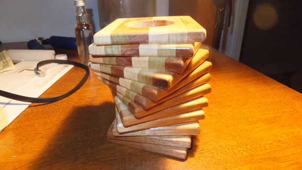 9), se procede a cualquier máquina y "slice" los bloques en azulejos alrededor 3/8" de espesor (puede hacer cualquier ness grueso pero encontré 3/8" atractivo). Usted debe dejarse con un montón de 2,5 "x 2,5" x 3/8" tejuelas de madera que son rayas y y tiene un orificio de 1/4" por la mitad.
