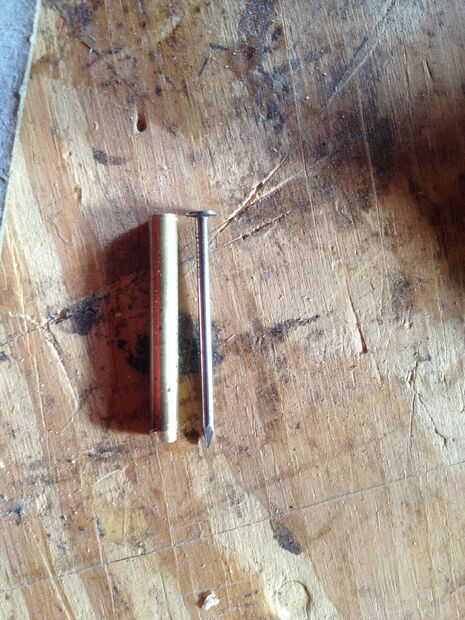 Encontré un tubo de cobre en mi garaje. Era del tamaño de un agujero de lazo de la correa, así que era perfecto. Encontrar un clavo que se ajusta dentro del tubo y luego cortar el tubo con una sierra para metales o una herramienta Dremel para que el tubo es ligeramente más corto que la uña.