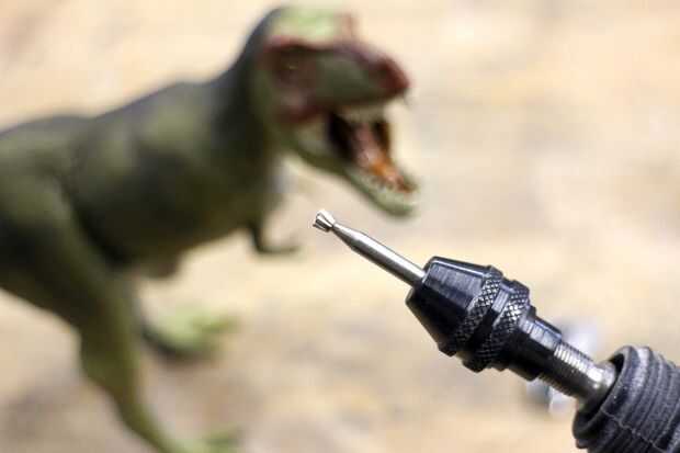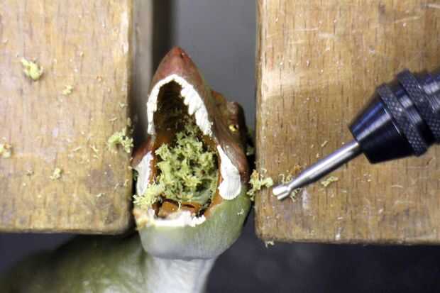A partir de un poco de talla pequeña en la herramienta rotatoria que cuidado tallado pequeñas secciones a la vez desde el interior de la boca. Constantemente me detuve a limpiar los desechos de plástico y verifique que me estaba quedando dentro de la envoltura del dinosaurio un no ráfaga hacia el lado de la cabeza.