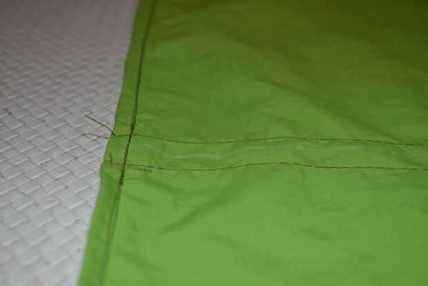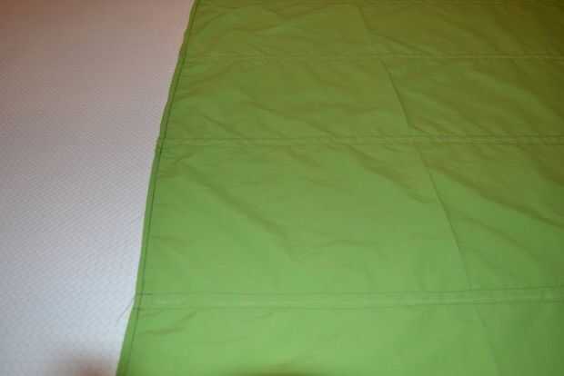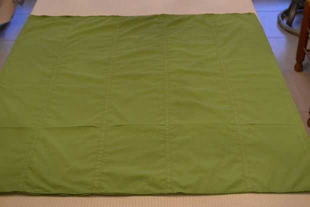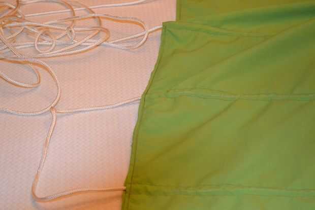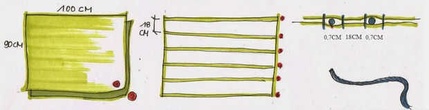 Como ves en las fotos de arriba, en el primer paso cosen a la tela doble de 90 x 100 cm y crean 6 ranuras. 6 ranuras son 7mm de ancho y se encuentra 18 cm unos de otros en la tela. Lo mejor es comenzar con toda la costura vertical (100 cm) líneas y luego terminar con las 2 costuras horizontales (90cm), saltando cada ranura.