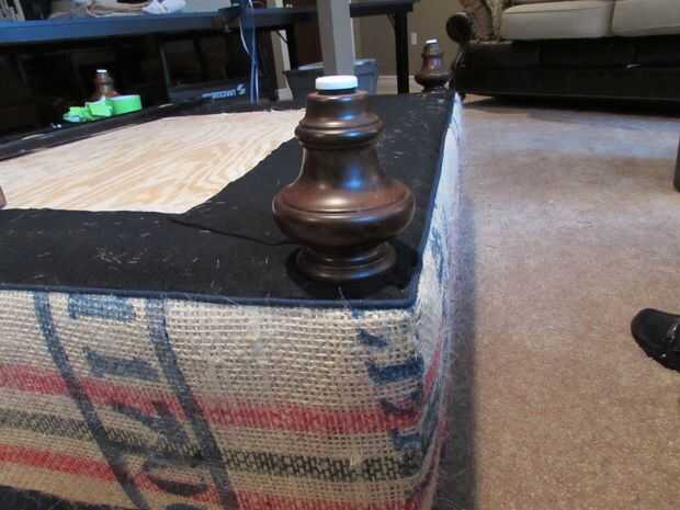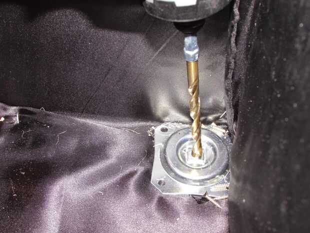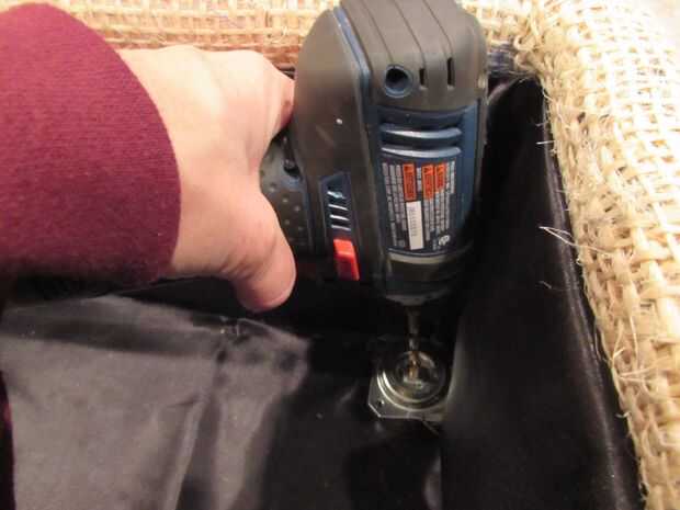Lo ideal es que se supone que instale una placa en la parte inferior de la pieza con cuatro pequeños tornillos, luego el tornillo en la pata, utilizando el perno de hangar. Pero tratando de perforar la tela y guata para crear todos esos agujeros probó problemático: las capas de tela y guata se mantuvieron envolver alrededor de la broca, en última instancia lo jamming.