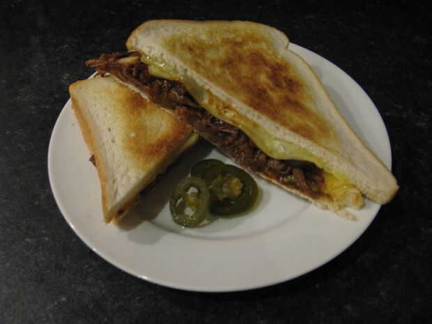 Tirado carne de barbacoa, Leerdammer y tostadas Jalapeño (hace 8 tostadas)