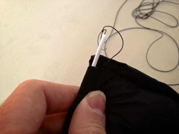Para obtener la cuerda elástica en el túnel, sólo cortar las cabezas de un scoop de oído y fijarlo a una cadena. Fijar la cuerda otra vez a la cuerda elástica. Este primer ajuste en la cadena y después te tire de la cuerda elástica con la cadena. Por supuesto una aguja embotada es también una opción...