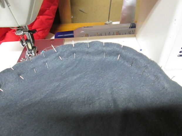 Usando pernos rectos encuentran el centro de la pieza del fondo y el frontal.  Facilidad la pieza de la parte inferior alrededor de la pieza frontal, usando tantos alfileres rectos como sea posible.  ¡ Excelente!