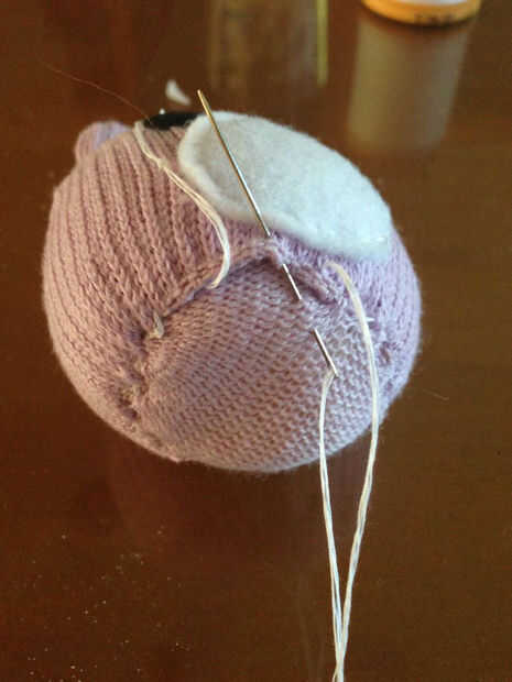 Está casi terminado, lo prometo. Todo lo que tienes que hacer ahora es tomar la pieza de tubo y colóquelo sobre el bolso de haba como una cubierta. Coser la parte inferior del tubo a la parte inferior de la bolsa de frijol, metiendo la capa adicional que agregó en el paso 1 dentro del tubo. Usé una puntada de costura oculta (similar a una puntada corriente y escalera, creo) para enlazar las dos piezas.