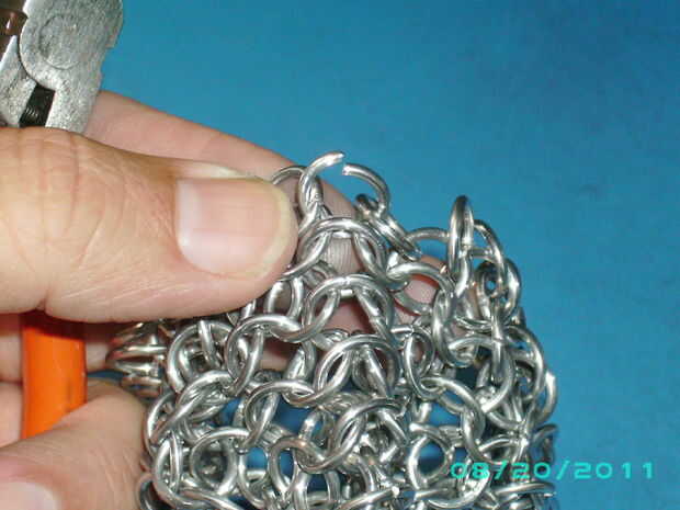 Comience en la parte inferior de los dos bordes han alineados, colocar un anillo a través de dos anillos de cada lado, esto va a crear el patrón estándar de 4-1. Anillo de cierre.