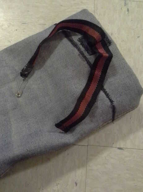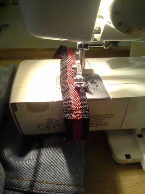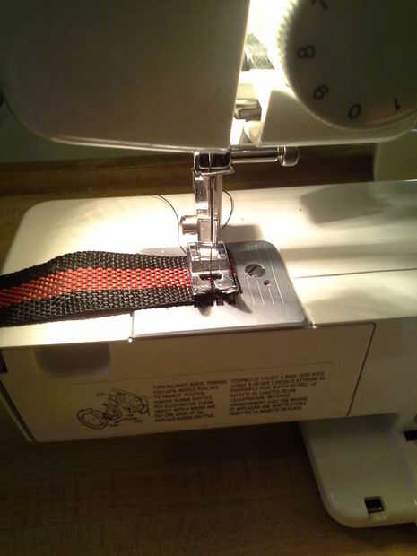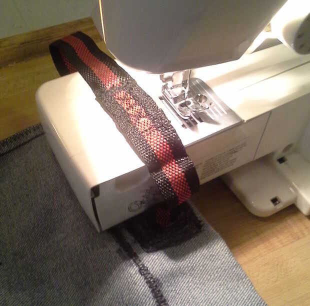 Coser la tira a sí mismo. Aquí es donde entran los extremos doblados en juego. Al juntar los extremos de la correa los extremos doblados deben ser entre las dos correas. Cuando todo está cosido juntos va a ser como los extremos están metidos en la zona de cosido.
