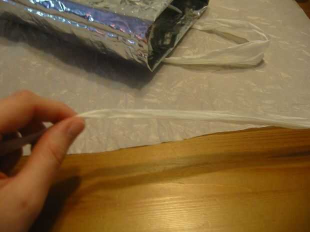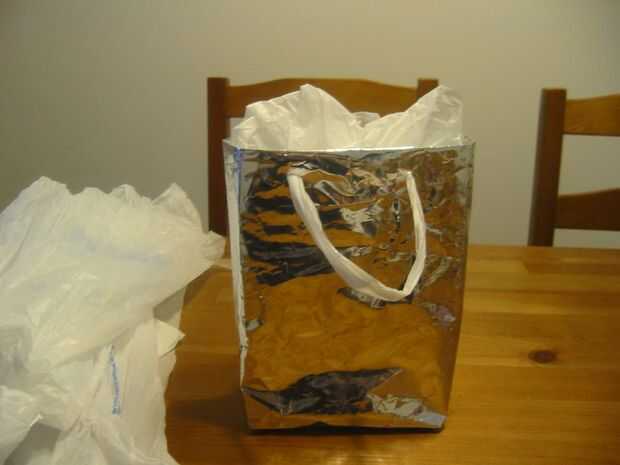 Esta bolsa ahorra energía en al menos dos formas. Le ahorra no tener que conducir hasta la tienda por una bolsa de regalo y se ahorra energía porque entonces hay por lo menos uno menos bolsa realizada que habría sido comprada. Si esta captura en unas muchas personas reutiliza las bolsas de viruta para bolsas de regalo, ahorra mucha energía.