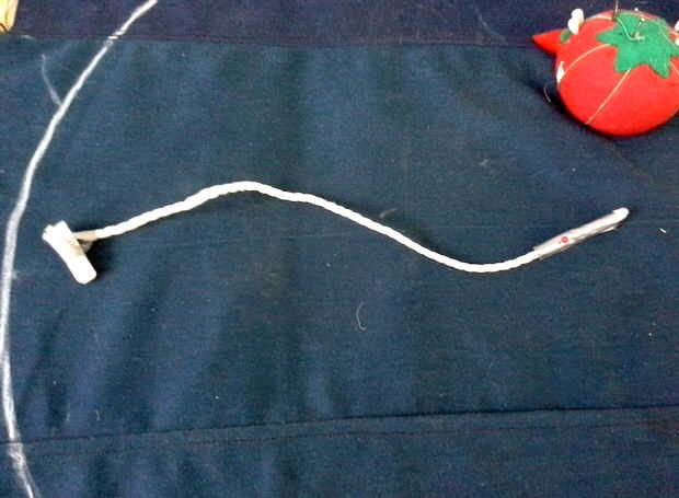 Encontrar el centro de su material y determinar la longitud de cadena que se necesita. Cuando haya determinado la longitud de cadena se necesita entonces envolverá poco de cinta alrededor de la cadena en ese momento. Le pones el pasador a través de la cadena y la cinta, esto evitará que el pasador de deslizamiento entre los hilos de la cuerda.