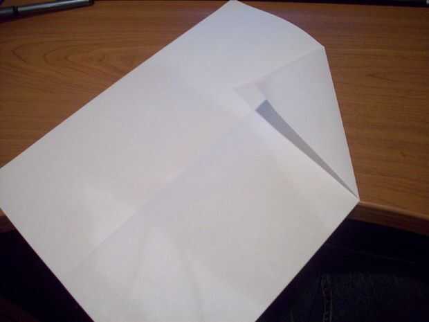Cuando haya terminado de estos cuatro dobleces, doblar el plano a lo largo del pliegue de la mediano para que coincidan los lados.
