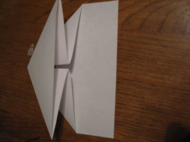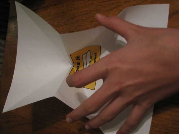 4. Voltee el papel detrás y empuje el centro de la x en. El papel debe comenzar a colapsar en una triángulo-cosa.